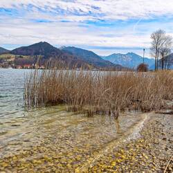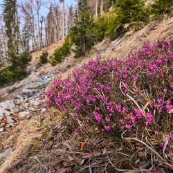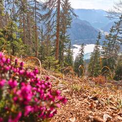 Hans hatte wieder eine tolle Tour ausgesucht, ganz nach meinem Geschmack. Gestartet sind wir in Klein-Kanada hinter Ruhpolding – eine Drei-Seen-Landschaft, die im Herbst sicher richtig schön ist. Von dort ging es auf einen Steig für Insider – schmal am Hang entlang, über Steine, Wurzeln, Grasflächen und an den ersten bunten Blümchen vorbei – in Serpentinen nach oben. Ich schlug ein etwas vorsichtigeres Tempo an, hörte aufs Herz – und wir waren dennoch in Hans-Normalzeit unterwegs! Langsam gehen war also dann doch irgendwie nicht, dafür war es sehr kontinuierlich. Immer wieder eröffneten sich Blicke auf den großen See im Tal, am schönsten war es am Aussichtspunkt Goldloch-Blick. Danach landeten wir wieder im Winter und im Abenteuer: Der Schnee war überwiegend überraschend fest, der Weg weg. Denn wir waren die ganze Tour absolut allein unterwegs – ein Traum! Also stapfe ich Hans durch Unterholz und Geäst hinterher, bis wir den Einstieg zum Gurnwandkopf (1691m) erreichen. Durch Latschen und Schnee kämpfen wir uns hinauf – klar ist: Grödeln zum Abstieg. Den nehmen wir recht rasch, denn nun ersprinten wir noch die beiden Gipfel der Hörndlwand (1684m). Es wird noch sonniger, das Herz ist glücklich. Die Gedanken sind nur bei mir und bei den Gesprächen mit Hans. Aber wir genießen beide großteils die Ruhe des Schweigens. Dann hören wir irgendwann wieder die Autos der Straße – die Zivilisation hat uns wieder. Ausklingen lassen wir den Tag bei Kuchen im Sonnenschein in Ruhpolding. Danke von Herzen für die Tour und die Freundschaft, Hans!