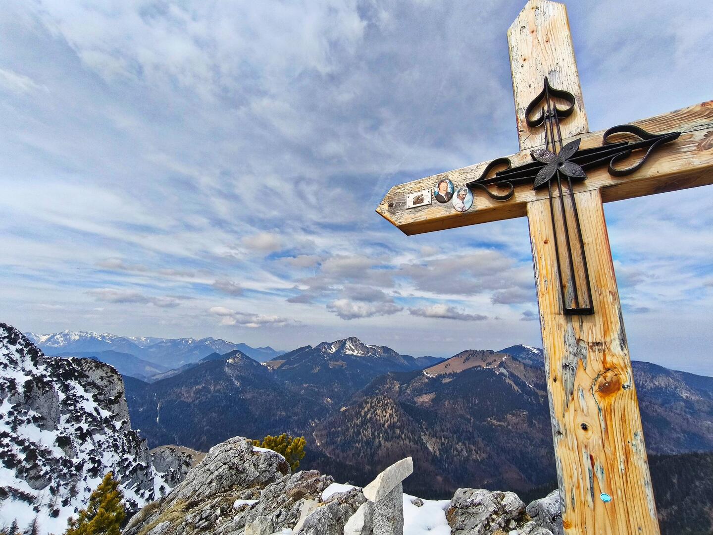 Na nochmal so a Traumtagerl! Und – ich hätte es nicht besser machen können mit der Tourenwahl, die mir echt nicht leicht viel, weil ich wollte schon gern so hoch es geht… Ich entschied mich für den Hochries 1569m, ein Chiemgauer Klassiker, der eigentlich immer überlaufen ist. Und am Parkplatz standen auch schon ein paar Autos morgens um 9 Uhr. Aber gut, drauf einstellen und durch. Am Ende hab ich beim Hochgehen zwei, drei Menschen getroffen, am Gipfel waren es zeitgleich maximal ne Handvoll und für ne Weile war ich oben sogar allein. Weg und Aussicht waren am Anfang eher so naja, Blick eher ins Flachland, aber ab der Wimmeralm wurde es – Stichworte Treppen, Steig, Schnee, eisig, Grödeln. Angegeben waren von unten so 2:45/30 hoch; ich marschierte in möglichst kontinuierlichem Tempo nach oben (Start 8.57, Gipfel 10.36 Uhr, 800hm, nicht ganz 5 km einfach); war mit Schnaufen, Gehen, auf mich Fokussieren, aufs Herz Achten und immer mal wieder Fotografieren beschäftigt. Das Tolle: zwei Tage mal nicht über die Arbeit grübeln. Ein Erfolg und gutes Zeichen für mich. Am Gipfelhaus saß ich dann eine Stunde in Sonne und Schnee – was für ein Panorama! Diese Weite, diese Macht, die Kraft der vielen weißen Gipfel, die wunderbare Einfachheit des Seins, die absolute Ruhe – abgesehen vom tropfenden Schmelzwasser. Und doch schlichen sich Gedanken ein: Wie ein Mensch plötzlich und unerwartet in ein Leben kommen kann und sich das so verdammt gut anfühlt… Irgendwann muss ich doch wieder gehen. Am Rückweg nehme ich noch einen Mini-Abstecher zu einem kleinen unbekannten Gipfelkreuz mit. Inzwischen wird der Aufstieg inflationär. Alles richtig gemacht – an beiden Tagen. *einfachnurdankbar*Read more
