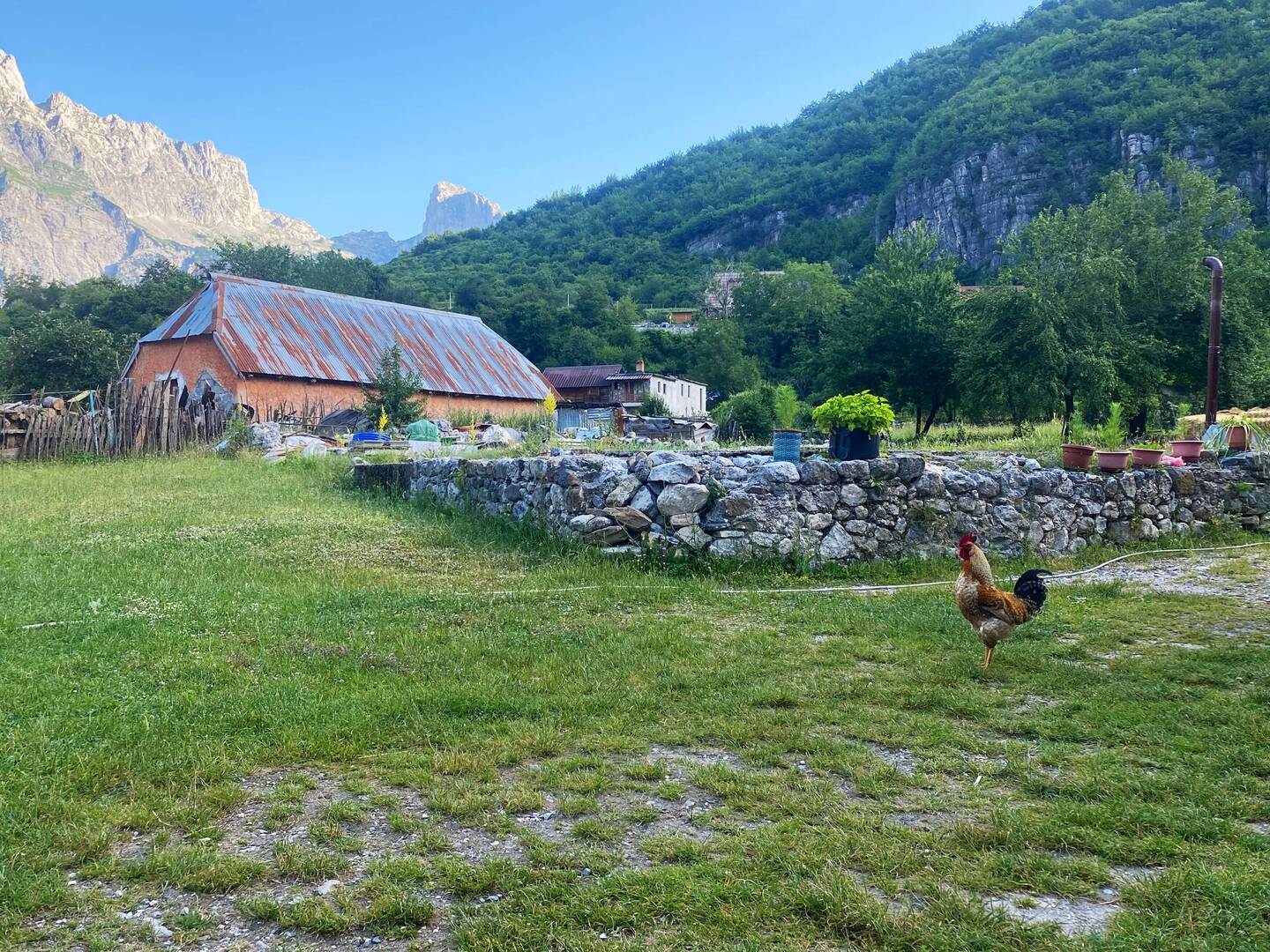 das arbeitsteilige Weckkommando aus Muezzin, Kirchenglocken und Wecker hat mich erfolgreich aus den Federn geworfen und so geht es schon um 7h morgens mit einem Kleinbus nach Theth. Die Fahrt von Shkodra nach Theth ist zunächst am Rande, später mitten innerhalb der Bergkulisse atemberaubend - genau wie der Fahrstil unseres Fahrers, der große Freude daran hat, sämtliche vor uns fahrenden Autos und Vans mit einer künstlichen Polizeisirene aus dem Weg zu drängeln und wenn sie endlich klein beigeben und genervt rechts ranfahren, wild gestikulierend an ihnen vorbeizupreschen. Mir ist sowas ja immer schon maximal peinlich gewesen und so bin ich auch heute froh, dass man mich hinter den abgedunkelten Scheiben des Sprinters nicht entdeckt 🙈😅. Trotz Überschallgeschwindigkeit erhasche ich einen kurzen Blick auf ein Gefängnis, ein riesiger Betonbau, der ziemlich abgelegen, vor wunderschöner Bergkulisse mitten auf die Felder gebaut ist. Ein ziemlich skurriler Anblick, der durch eine Reihe von Weisheiten, die außen auf die Gefängnismauern gesprüht sind, noch verstärkt wird. So steht zum Beispiel in riesigen Lettern auf den Gefängnismauern: „Education is the best way to freedom.“ Und selbst wenn ich der Aussage zustimme, bin ich mir unsicher, wie ich sie in diesem Kontext werten darf. Ehe ich mir eine Meinung gebildet habe, sind wir schon vorbeigerast. Wir haben es mit einem wahren albanischen Bleifuß zu tun, zugegebenermaßen sind wir aber dank seiner Fahrkünste schon um kurz nach 9h in Theth angekommen. Ich laufe zu meinem Guesthouse, wo ich noch etwas auf mein Zimmer warten muss und in der Zwischenzeit vor herrlicher Bergkulisse mein erstes albanisches Frühstück genieße. Es gibt frisches Brot, Tomaten, Gurken, zwei verschiedene Sorten Käse, der eine sicherlich aus Schafsmilch, Honig und eine absolut köstliche Feigenmarmelade. Ich bin eigentlich kein ausgesprochener Marmeladen-Fan, aber diese Art von Feigenaufstrich liegt irgendwo zwischen Rübenkraut, Feige und Karamell und ist genau mein Ding. Später erkundige ich ein bisschen das hübsche Theth, ein Dörfchen im Valbona-Tal, in dem man bis auf das Rauschen eines kleinen Flusses, Kuhglocken, das Krähen eines Hahnes und Vogelgezwitscher nicht viel hört. Bis auf das sporadische Aufheulen von Motoren aufpolierter SUVs und Limosinen, auffällig häufig deutschen Fabrikats. Die Albaner scheinen Mercedes, BMW, Audi und VW zu lieben, so viele dieser Marken auf einem Fleck habe ich in Deutschland selten gesehen. Gerne werden auch fleißig die Fenster heruntergekurbelt, um dann mit laut aufgedrehter und durch entsprechende Bässe untermalter Musik durch das Dörfchen zu kurven. Davon abgesehen ist Theth aber ein sehr malerischer Ort und der Startpunkt für viele Wanderungen in den albanischen Alpen. Es gibt unheimlich viele Pensionen und kleine Gästehäuser, ich sehe aber auch viele Camper, Bullis, Zelte und Motorradfahrer aus aller Herren Länder. Bei meinem Bummel durch das Dörfchen komme ich an der kleinen Kirche von Theth vorbei und lausche einem älteren Herren, der unter der Linde neben der Kirche auf einer Laute ein kleines Konzert gibt. Eine kleine Lauschprobe bekommt Ihr auf dem Video zu hören😌. Leider ist die Internetverbindung nicht gut genug, um meine Kamera mit meinem Handy zu verbinden, sodass ich ein paar Bilder aus Theth, die ich mit der Kamera gemacht habe, nachträglich in die App laden werde.