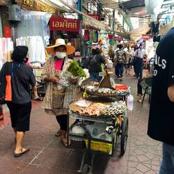Ich habe die erste Nacht im Hostel soweit gut überstanden, auch wenn ich nachts gute zwei Stunden wach lag weil mein Rhythmus sich noch nicht an die neue Zeitzone gewöhnt hatte. Die thailändische Zeit liegt sechs Stunden vor der deutschen Winterzeit und so glaubt mein Körper, ich wäre ernsthaft um 17h ins Bett gegangen und ist verwirrt. Irgendwann schlafe ich dann aber doch wieder ein und da es im Mehrbettzimmer komplett dunkel ist verschlafe ich prompt das Frühstück. Zum Glück hat das Hostel ein hübsches Café mit Dachterrasse und hervorragenden Cappuccino, sodass ich nicht hungrig in den Tag starten muss. Gut gestärkt mache ich mich durch das quirlige China Town mit seinen schier unendlichen Marktständen auf den Weg zum Großen Palast, nur um am Eingang erstmal höflich zurückgewiesen zu werden. Ich hatte vorher gelesen, dass Besucher sich angemessen zu kleiden haben und fühle mich mit einer langärmeligen Bluse und schwarzer Leggins auf der sicheren Seite. Weit gefehlt, denn die die Leggins erweist sich als unangemessenes Kleidungsstück (da hätte man schon drauf kommen können, schließlich kann ich mich nicht erinnern, jemals in Leggins in einer Kirche oder ähnlichen Orten aufgekreuzt zu sein🤦🏼♀️, aber das Fassungsvermögen und die vielen kleinen Täschchen und Winkel vom Gregy sind nun einmal begrenzt) und so entscheide ich spontan, den Großen Palast auf den nächsten Tag zu verschieben und besuche stattdessen den buddhistischen Tempel des Goldenen Buddha, den Ihr auf einem der Fotos sehen könnt und der sich von meinem Outfit vollkommen unbeeindruckt zeigt. Mit mir besucht unter anderem eine indische Reisegruppe den goldenen Buddha und ehe ich mich versehe, bekomme ich ein Handy nach dem anderen in die Hand gedrückt und werde eingespannt, um eine Familie nach der anderen zu fotografieren, während mir die jeweiligen familiären Verhältnisses detailliert erklärt werden und ich teilweise kurzerhand mit abgelichtet werde. Nun ziere ich also als blasser und blonder Akzent alle möglichen indischen Familienfotos - auch schön😆.