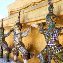 Die zweite Hostel-Nacht verläuft läuft deutlich besser als die erste und ich schaffe es dieses Mal pünktlich zum Frühstück, wo ich von Paula aus Schweden angesprochen werde, die auf eine Freundin wartet, mit der sie die nächsten Wochen durch Südostasien reisen wird. Noch ist sie aber alleine unterwegs, weshalb wir entscheiden, gemeinsam (und dieses Mal angemessen gekleidet) den Großen Palast zu besichtigen. Dieser zieht uns mit seinen vielen bunten Farben, Mosaiken, goldenen Statuen und Wandmalereien vollkommen in den Bann und lässt den Kameras keine ruhige Sekunde. Paula erweist sich als sehr angenehme und unkomplizierte Begleiterin und so entscheiden wir uns im Anschluss an die Besichtigung des Großen Palasts noch für eine Fahrt mit der Fähre auf dem Chao-Phraya-Fluss, der durch Bangkok fließt, zu unternehmen und für ein gemeinsames Abendessen am Ufer des Flusses. Von hier aus wuseln wir uns dann gemeinsam zum Hostel, da ich noch am selben Abend den Nachtbus in Richtung der Insel Koh Tao nehme und noch irgendwie im Feierabendverkehr vom Hostel zur Bushaltestelle kommen muss. Wegen der verrückten Verkehrsverhältnisse klappt dies tatsächlich am besten zu Fuß und ich bin sehr erleichtert, pünktlich bei dem Reisebüro anzukommen, über dessen Homepage ich die Tickets bereits vor einigen Tagen gebucht hatte. Von der Reise nach Koh Tao und meiner Zeit dort berichte ich Euch gerne im nächsten Footprint, während ich gerade schon wieder auf der Fähre auf dem Rückweg von Koh Tao bin.