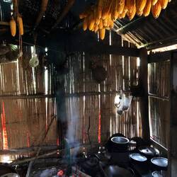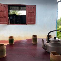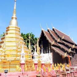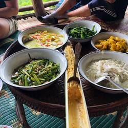 Gleich nach dem Frühstück am nächsten Tag holt mich der Inhaber des Tourenveranstalters ab und fährt mit mir und sechs weiteren Wanderern etwa 45 Minuten außerhalb von Chiang Rai in die umliegenden Hügel, wo wir eine eintägige Trekking-Tour unternehmen werden. Es geht ziemlich steil bergauf durch Bambuswälder, Ananas-, Kaffee-, Tee- und Kakaoplantagen, durch Reisfelder und an Wasserfällen vorbei bis wir in einem kleinen Dorf einkehren, wo wir mit einem Mittagessen versorgt werden. Die Bevölkerung hier oben in den Hügeln ist meist nicht thailändischen Ursprungs, sondern stammt aus China beziehungsweise aus Tibet, wie uns erklärt wird und was an den vielen rot-goldenen Lampions und Schriftzeichen an den Türen im Dorf sichtbar wird. Besonders beeindruckt hat mich allerdings das frisch zubereitete Essen und hier insbesondere das Rührei, das in dieser Gegend traditionell mit Tomaten und Zwiebeln in einem Bambusstab zubereitet wird, der für einige Minuten ins Feuer gelegt wird. Ihr könnt diese thailändisch-chinesische Rührei-Variation im aufgeschnittenen Bambusstab auf einem der Bilder sehen - sie steht der Pfannen-Variante wirklich in nichts nach☺️. Gestärkt vom Mittagessen geht es noch einige Stunden weiter durch den Bambus-Dschungel bis wir die Wanderung in natürlichen heißen Quellen am Rande der Hügel ausklingen lassen. Auf dem Rückweg fahren wir über einen Fluss und sehen im Vorbeiflug sogar in Freiheit lebende Elefanten - leider hatte ich die Kamera vor lauter Staunen nicht so schnell zur Hand, sonst hätte ich sie Euch gerne aufgenommen. So bleibt mir die Erinnerung im Kopf als ich abends ziemlich erschöpft, aber froh und zufrieden im Bett liege.