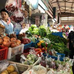 die thailändische Küche wäre vermutlich eine vollkommen eigene Berichterstattung wert, jedenfalls habe ich schon allein in meinen drei Wochen hier so viele unterschiedliche Curries, Nudel- und Reisgerichte, gekocht, gebraten oder als Suppe, probiert, dass ich mich entschieden habe, zumindest einen halbtägigen Kochkurs zu besuchen und so vielleicht ein paar Geschmacksexplosionen mit nach Hause zu nehmen. Ich werde also früh morgens von der Veranstalterin des Kochkurses an meiner Unterkunft eingesammelt und nachdem wir die übrigen Teilnehmer abgeholt haben, fahren wir zunächst auf einen Markt außerhalb von Chiang Mai, auf dem wir ein paar grundlegende Zutaten einkaufen. Ehe ich mich versehe, werde ich in eine südkoreanische Reisegruppe integriert, die gleich alles mögliche Gebäck und frisch gepressten Ananassaft auf dem Markt kauft und mich hieran wie selbstverständlich teilhaben lässt. Irgendwie komme ich immer wieder mit Südkoreanischen Reisenden ins Gespräch, so auch beim Kochkurs. Unser Gruppenfoto vom Markt (✌🏽😆) habe ich Euch hochgeladen. Auch während des Kochkurses haben wir wirklich viel Spaß miteinander und als ich dann noch erwähne, dass ich mit dem koreanischen Reisschnaps Soju (gruseligerweise traditionell gemischt mit Bier) vor ein paar Jahren den Kater meines Lebens hatte (liebe Katharina - ich vermute, Du erinnerst Dich?😆😘), bin ich endgültig als vollwertiges Mitglied der Reisegruppe aufgenommen.