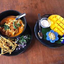Vom Markt aus geht es weiter zu einem Bauernhof, wo der eigentliche Kochkurs stattfindet. Hier laufen wir zunächst durch den Gemüsegarten und sammeln allerlei Kräuter und Gewürze für unsere Gerichte, wie zum Beispiel Zitronengras, Thaibasilikum, Kaffir-Limettenblätter, Chili, Galgant, Ingwer und Koriander. Anschließend können wir uns bei der Vorspeise zwischen zwei verschiedenen Suppen und bei der Hauptspeise zwischen vier verschiedenen Curries entscheiden, zusätzlich werden wir Pad Thai (ein Gericht mit gebratenen Nudeln) und Mango Sticky Rice zubereiten. Ich entscheide mich für Tom Ka Gai (Kokosnusssuppe) zur Vorspeise und zur Hauptspeise für Khao Soi, eine nordthailändische Currysuppe mit Nudeln. Wir können jeweils wählen, ob wir Garnelen, Hühnchen oder Tofu haben möchten und ich freue mich, dass Tofu angeboten wird. Auch wenn ich keine Vegetarierin bin, wird mir hier zwischendurch der Fleisch- oder Fischanteil deutlich zu viel, insbesondere in den Garküchen. Tatsächlich kommt es regelmäßig vor, dass es kein einziges vegetarisches Gericht auf der Karte gibt und so freue ich mich, dass der Kochkurs alle Befindlichkeiten berücksichtigt. Welches Gericht mir nun am besten geschmeckt hat, ist gar nicht so leicht zu sagen. Wenn ich mich entschieden müsste, wäre es am ehesten das Khao Soi, denke ich. Vielleicht habt Ihr auf den Bildern einen Favoriten entdeckt? Die Rezepte haben wir alle erhalten und so bin ich gespannt, ob mir die thailändische Geschmacksexplosion auch in Nippes gelingen wird.