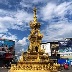 Am nächsten Morgen beschließe ich, Chiang Rai noch etwas zu Fuß zu erkunden und mir insbesondere die beiden Hauptattraktionen, den Blauen und den Weißen Tempel, anzuschauen. Auf dem Weg zum blauen Tempel laufe ich zufällig durch das muslimische Viertel Chiang Rais, was mir daran auffällt, dass die Frauen auf einmal Kopftuch tragen und die Metzgereien und Restaurant als „halal“ gekennzeichnet sind. Als ich in eine kleine Seitenstraße abbiege, laufe ich geradewegs auf eine kleine Moschee mit goldenen Zwiebeldächern zu, die ich Euch fotografiert habe. Als ich dann auf dem nächsten Straßenschild noch lese, dass ich gerade auf der „Aladin Road“ (wirklich - siehe Foto ☺️) herumschlendere, bleibt keine Frage mehr offen. Ich hatte im Reiseführer gelesen, dass in Chiang Rai ganz unterschiedliche Kulturen und Angehörige verschiedener Religionen zusammenleben, was wohl in erster Linie an der geografischen Lage und der Nähe zu Laos, China und Myanmar liegt. Auch im Straßenbild wird dies deutlich sichtbar, denn die Straßenschilder und auch viele Menükarten in den Restaurants sind sowohl auf Thai als auch auf Chinesisch. Außerhalb des muslimischen Viertels komme ich immer wieder an christlichen Schulen und Krankenhäusern vorbei, die sich zwischen die vielen buddhistischen Tempel zu mogeln scheinen. Wirklich spannend, hat Chiang Rai doch gerade einmal knapp 80.000 Einwohner.