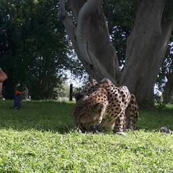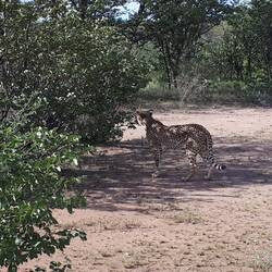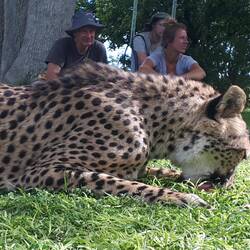 We are at the campsite of a cheetah sanctuary. We were welcomed by the owners. They get cheetahs that they try to replace in the wild. They also have 3 cheetahs, that they got as cubs, and they neededLeia mais