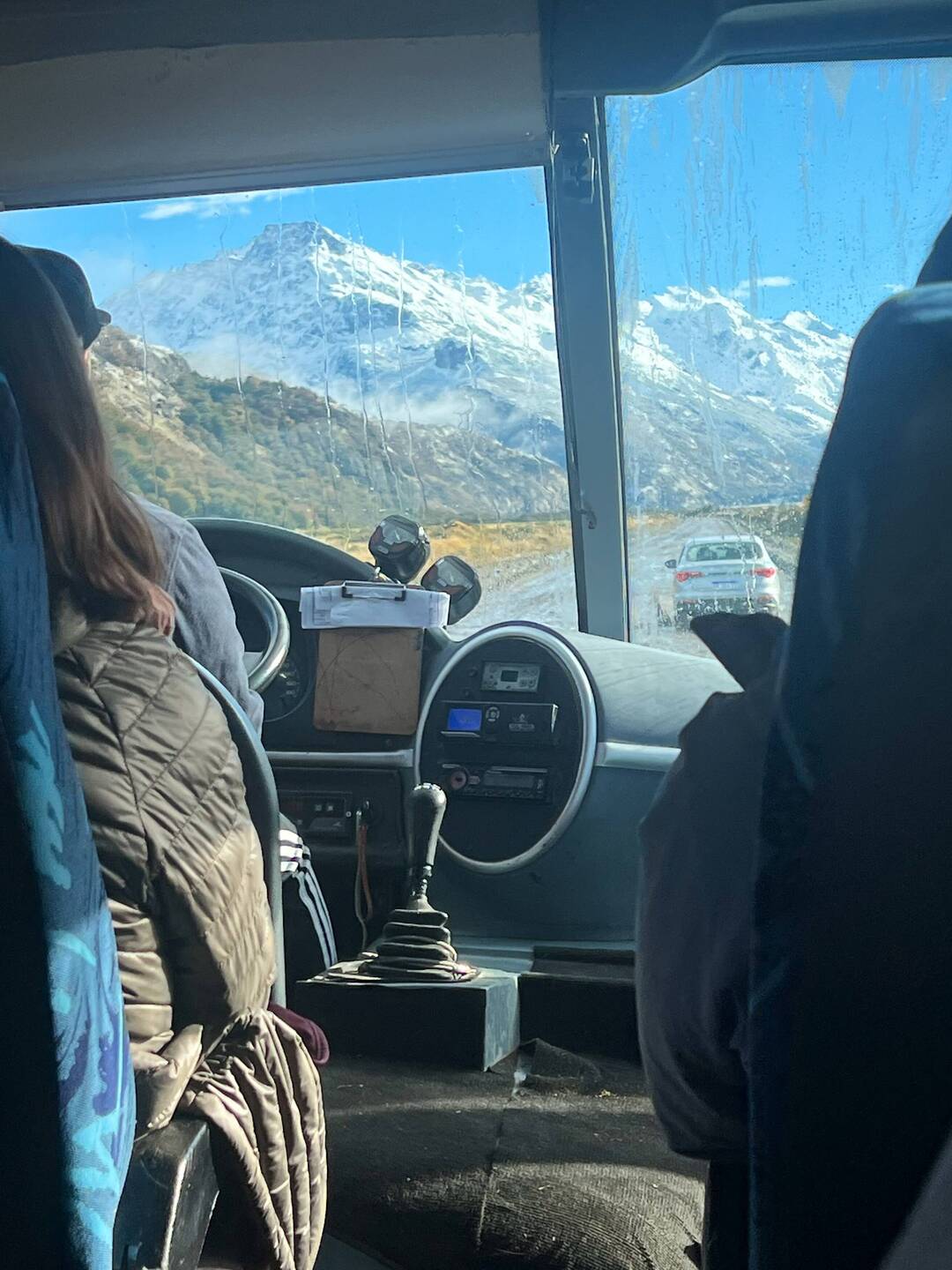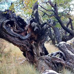 Dem Tipp von Beth folgend, hat Norbert sich nach dem Bus erkundigt, der uns heute morgen (Start 10:00 Uhr) zum Rio Eléctrico bis Piedra del Fraile gebracht hat. Es ging 45 holprige Minuten hinter ins Tal. Der Riesenvorteil: wir mussten nicht den gleichen Weg hoch und runter laufen, sondern sind in dem Tal, in dem auch El Chaltén liegt, weiter nördlich gestartet und nach El Chaltén in südöstliche Richtung zurückgelaufen und hatten dabei mehr Aussichten auf das Felsmassiv, zu dem der Fitz Roy gehört. Am Anfang war es noch recht bewölkt. Es ging erst durch ein breites Tal mit einem recht kleinen Bach, den wir immer mal überquert haben. Dann haben wir den östlichen Bergrücken langsam erklommen. Dabei ging es weiter in Richtung Süden mit Blick auf die schneebedeckte Bergkette im Westen, die von der Sonne beschienen wurden. Es war ein herrlicher Wald voller knorriger Bäume. Nur leider hat es darunter "geregnet", weil der matschige Schnee von den Blättern runter rutschte.