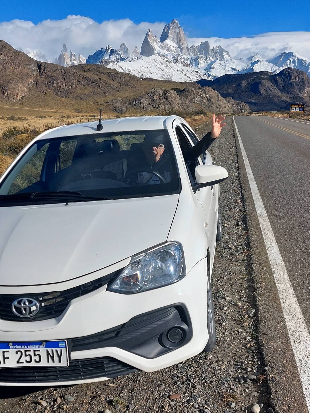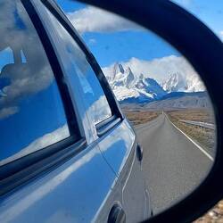 Wir waren später dran, als gedacht. Nach einem letzten, leckeren Frühstück "Americano" saßen wir 10:20 Uhr im Auto. Hinter uns ließen wir eine super Aussicht auf den Fitz Roy - besonders für alle, die uns auf der Strasse nach El Chaltén entgegenkommen. Auf dem Weg zur RN 40 habe ich mindestens 10 Kondore auf einem Fleck am linken Strassenrand gesehen - echt große Vögel. Ich vermute, dass es dort ein totes Tier gab. Leider hatten wir keine Chance zum Anhalten - falsche Spur und zu viel Verkehr. Die Fahrt ging entlang des Lago Viedma und man sah immer nochmal schneebedeckte Berge.