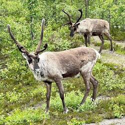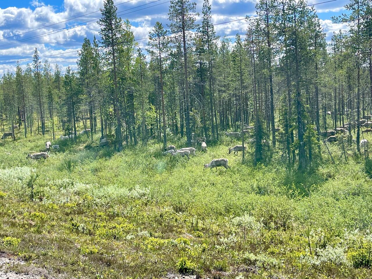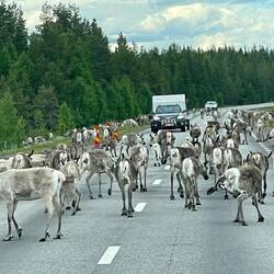 Auf der Weiterfahrt geht einer unserer Wünsche in Erfüllung. Wir sehen plötzlich am Strassenrand eine riesige Herde Rentiere. Wir halten an und beobachten / fotografieren. Die Rentiere überquerenLeer más