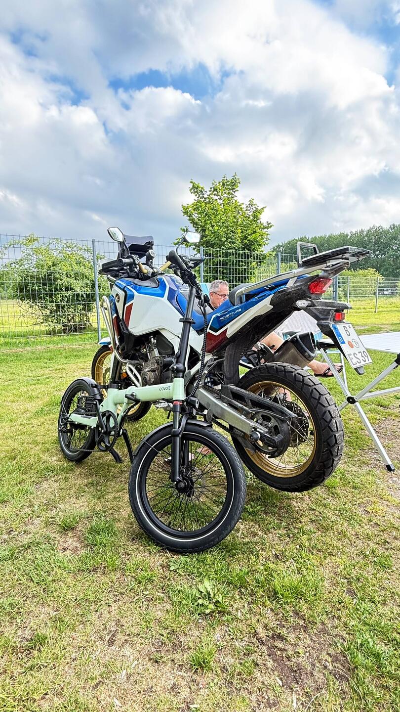 Macht es sich nicht gut, mein kleines Faltrad und Mattes schickes Motorrad?