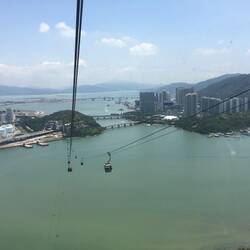 Schöne Fahrt mit dem Glasboden Cable Car nach oben auf den Peak von Lantau Island. Dort wird man dann von einer Shopping Meile empfangen bevor es zum Buddha hoch geht.