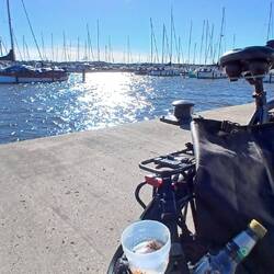 Fahre zum Hafen und erinnere mich an den dritten Kaffee, den ich ja noch in meinem Super-Thermosbecher habeLue lisää