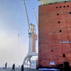 Blick von der Jan-Fedder-Promenade auf den Stückgut-Frachter "MS Cap San Diego" der Reederei Hamburg-Süd und die Überseebrücke, von wo aus früher die Kreuzfahrer ablegten.