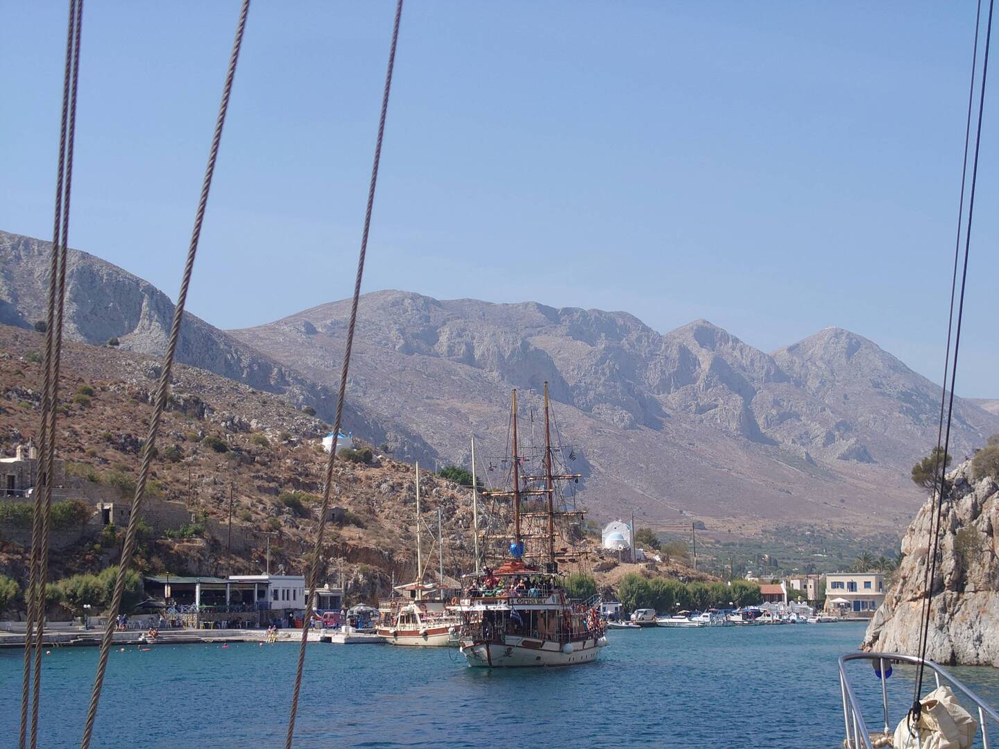 Het eerste eiland dat we aandoen is Pserimos. Een vrijwel onbewoond eiland met een klein dorpje waar we genieten van een lekkere Mythos.