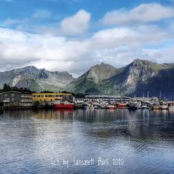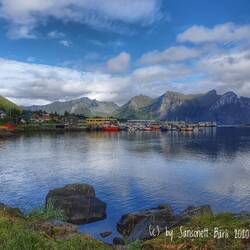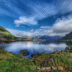 Es gibt heute direkt mal längere sonnige Abschnitte, kaum Wind und damit herrliche Reflexionen. Senjahoppen, ein kleiner Ort, einige Fischerboote, blauer Himmel, schon ist es Urlaubsfeeling.