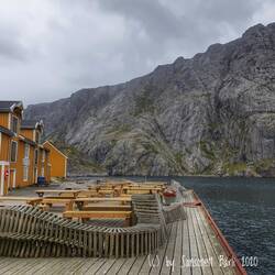 Von der E10 zeigt eine kleine Straße ab. Zunächst scheint es, als ob man auf einen Berg zusteuert. Aber schon bald entdecken wir den Fjord. Es ist nicht weit bis zum Ort. Pünktlich zum Aussteigen beginnt es zu tröpfeln.