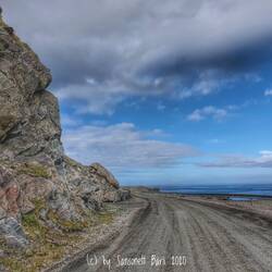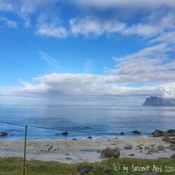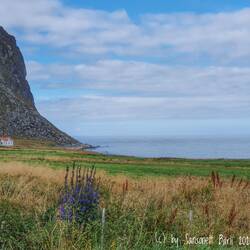 Und nun fahre ich die kleine holprige Strasse nach Myrland. Rechts von mir gibt die Aussicht alles, was sie hat, links bieten die grüngelb bewachsenen Berge Schutz. Schafe liegen gemütlich auf der Strasse und lassen sich nicht stören. Welche Ruhe hier, welch Frieden. Der dort selbst ist auch so ein Ende der Welt und ich frage mich, was machen die hier in der Dunkelzeit? 7 Häuser vielleicht und die paar Schafe? Leider finden wir keinen Zugang zum Strand. Alles ist mit elektrischem Weidezaum gesichert. Für ein tolles Foto reicht es, wenn auch mit Stromleitung mittendrin. Aber Stromleitungsbauer arbeiten nicht nach ästhetischen Gesichtspunkten, wir müssen das nehmen, was wir haben, nicht das, was wir uns wünschen.