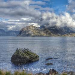Die gemütliche Fahrt zurück hat die Aussichten noch verbessert. Ab und an schimmert das Wasser des Nordmeers hier in der Bucht bläulich und Karibikgrün. Einige Kormorane sitzen auf einem Felsen und trocknen sich das Gefieder. Eine Möwe sitzt zwischen ihnen als wäre sie Tante Giesela in ihrem Strickkreis.