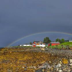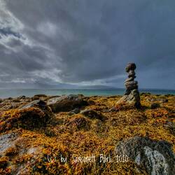 Bei uns scheint die Sonne, weiter vorne regnet es aus dunklen Wolken. Ein zarter Regenbogen spannt sich über den paar Häusern da. Ein grosses Steinmännchen überschaut den kleinen, steinigen, wilden Beach mit dem schlüpfrigen , leuchtend ockerfarbenen Blasentang. Ach, schön hier...