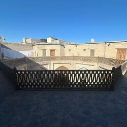Arrived and spent a night at the trips-off-the-tongue named Historical Caravan Sarai Mekhtar XIX century Hotel. Very old feel on the first floor. Photo from the door of my room shows the hexagonal nature.