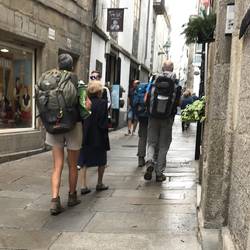 Så kom “pilgrimmen” til Santiago Compostela efter hun har vandret 130 km. Turen her tilbydes af rejseselskaber fra hele verden, jeg talte med et par som kom fra Mexico, man flyver herned, går fra Sarria til Santiago med overnatninger undervejs.