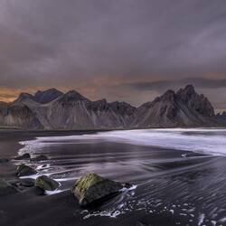 Sonnenaufgang am Vestrahorn war nichts. Also die Wärme und das Bett genießen. Frühstück war Inklusive. Da nun etwas mehr Wasser am Vestrahorn, versuche ich noch Reflexionen einzufangen.