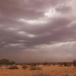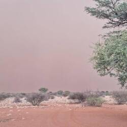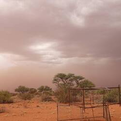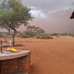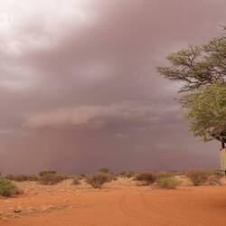 Das Grillfeuer lodert schon, der Topf für die Nudeln steht schon drauf. Innerhalb von wenigen Minuten verdunkelt sich der Himmel. Erst nur schwarze Wolken gefolgt von heftigen Windböen, die unsere schöne glühende Grill Kohle in die Stroh trockene Prärie bläst. Panik bricht aus, wir wollen ja Schreibers Farmland nicht abfackeln! Der Wasserhahn am Grill dient als Löschwasserquelle und mit Töpfen und Schüsseln versuchen wir die umherfliegenden glühenden Kohlestücke zu löschen, bevor diese die dürren Büsche anzünden. Die Böen werden zum Sturm und der bringt auch den für das Land und im Augenblick auch für uns, so wichtigen Regen. Leicht nass retten wir uns in die Juse, guten Gewissens, dass der Regen unsere Glut auslöscht. Doch dann trauen wir unseren Augen nicht.
