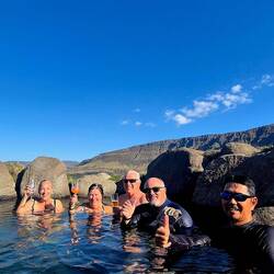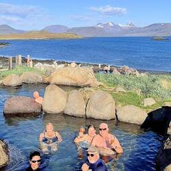 A fulfilling afternoon: water falls, horses, geysers, lunch, and a relaxing soak in a hot- spring .