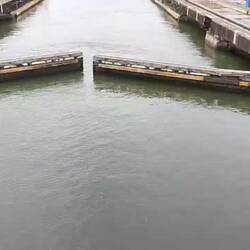 高級時計店がずらりと並んでいる??全然。ただの看板😜。そして、船が通過できるための開閉式の歩行者専用の人道橋。