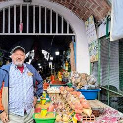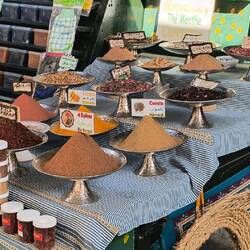 Lively market area lined with spices, fruits, clothes, shoes and more.