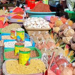 スパイス、果物、野菜、衣類、靴などが並ぶ活気ある市場。