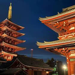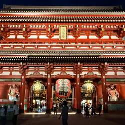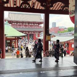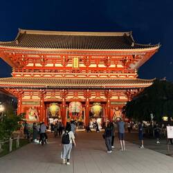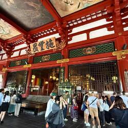 Zurück im traditionellen Stadtteil Asakusa mischen wir uns mit unter die Gläubigen. Das buddhistische Heiligtum ist Kannon, der Göttin der Barmherzigkeit geweiht. Man betritt es durch das DonnertorLäs mer