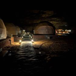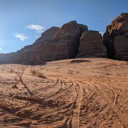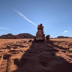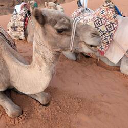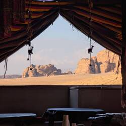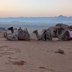 #After visiting Petra, Wadi Rum was next on our list. A desert! Our driver took us to the meeting point, where someone from the camp picked us up. It wasn’t quite as rustic as it used to be—our bubble tent had air conditioning and a private bathroom. There was even hot water, and in the evenings, the AC worked perfectly well as a heater 🙏.Two days of adventure and tradition awaited us. They called it a “jeep tour” here, but in reality, they were pickup trucks with seats in the back—just like the ones you’d see in Africa. We visited many famous movie locations: Dune, Star Wars, Aladdin, The Martian, Indiana Jones, and more. It was truly impressive to see it all in person!We climbed up several rock formations—some easier than others 😅. Before and after dinner, everyone gathered around the fire for tea 🔥. Later in the evening, we went stargazing 🌌—absolutely breathtaking! Our guide, a Bedouin, made delicious tea, and we sat together around the fire in the middle of the desert.Before breakfast, we set off on our 🐫 camel tour. At sunrise, we got to ride these large, gentle animals for a while. Anna was a bit more hesitant than Michael, but both made it safely back to camp. For the second sunset, we sat once again in the sand with tea and shawarma, enjoying the peaceful time together. Our guide was incredibly warm-hearted—and made the best tea 💕.Dinner was partly cooked in the traditional way, underground. Meat, rice, and vegetables were left to cook for about two hours. In addition, there were countless salads, vegetables, hummus, and warm lamb dishes. It was absolutely delicious 🤤. Wadi Rum said goodbye with rain, and our journey continued toward the Dead Sea.Read more