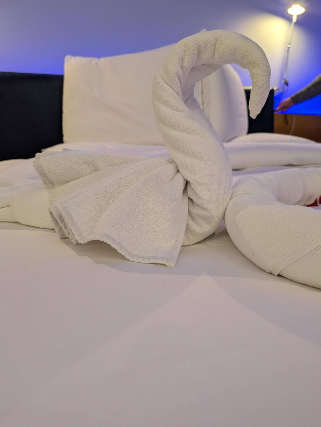 Wir hatten eine Außenkabine, und es gab mehr als genügend Handtücher für alle, sogar Ponchos. Alles, was wir auch außerhalb der Kabine nutzten, war nummeriert, sodass jeder wusste, was ihm gehörte. Warum wir das erwähnen? Weil es einfach so angenehm war – es machte alles für alle viel einfacher! Jeden Tag wurde das Bett gemacht, und es gab Schokolade 🍫.