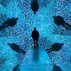 The buildings on the city promenade, however, have a more modern and artistic design. The library has a glass front and looks like stacked 📚 . You can walk up to the Opera House and have a fantastic view of the city. From up there, you can also see the "small" saunas floating on the fjord. Since it gets dark around 4 pm here, we took the train to Ekebergparken. We walked up from the station and had a clear view of the city with all its lights. Currently, there's a light installation in the sculpture park called "Nordic Pixel Forest". The lighting of the lights changes in sync with the music ✨.