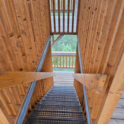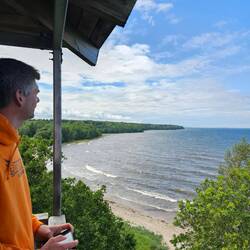 Da hier an der Straße immer wieder Schilder stehen, die vor eventuellen Kreuzungen von Elchen hinweisen, machen wir bei einem Hinweis auf einen Aussichtsturm halt.
