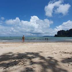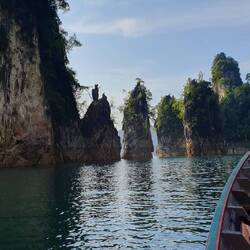 Angekommen in Surat Thani fuhren wir ca. 2h in die Nähe des Kao Sok Nationalpark. Hier übernachteten wir in Mitten der Natur in einem Dschungelhaus für eine Nacht. Von unserer Terrasse hatten wir einen Ausblick auf einen riesigen Kalksteinberg, welcher charakteristisch für diese Gegend ist. Am nächsten Morgen ging es dann auch schon los mit unserer Hauptaktivität und wir fuhren in den Kao Sok Nationalpark bzw. Ratchaprapha. Dies ist ein Süßwassersee, welcher gleichzeitig als Staudamm dient. Unsere Gruppe bestand aus 10 Leuten und unserem Tourguide. Angekommen am Hafen ging es mit dem Boot direkt raus auf den See, denn wir werden auf ihn in einem schwimmenden Dorf übernachten. Was mir sofort auffiel war, dass dieser See und seine riesigen Felsen eine große Ähnlichkeit mit Halong Bay hat, jedoch war diese thailändische Version wesentlich schöner. Das Wasser war aufgrund des Kalksteins türkisblau und ich habe während meines gesamten Aufenthalts kein einziges Stück Müll irgendwo gesehen. Ebenso gab es aufgrund der Saison kaum Touristen. Angekommen in unserem kleinen Dorf gingen wir bei schönem Wetter direkt baden und fuhren mit den Kayaks ein bisschen herum. Danach ging es mit dem Boot weiter hinaus in den Nationalpark und wir besichteten eine Höhle und wanderten durch den Dschungel. Unser Guide konnte uns sehr viel beibringen und war eine angenehme Begleitung. Teilweise sah die Landschaft, welche ich zu Gesicht bekam aus, als wäre sie von einem anderen Planeten. Ich liebte es hier. Es war wahrlich wunderschön, friedlich und still. Am nächsten Morgen gingen wir dann noch früh auf eine kleine Safari. Unser Guide erzählte uns, dass hier auch freilebende Elefanten leben. Da diese jedoch vor kurzem Nachwuchs bekamen, sind sie tief in den Dschungel migriert. Stattdessen war unser Ziel Gibbons zu sehen. Es dauerte keine 10 Minuten bis wir die ersten Affen in den Bäumen vor unserem Dorf rumschwingen sahen. Diese waren jedoch keine Gibbons. Auf unserer weiteren Fahrt sahen wir noch Vögel, Echsen und weitere Affen. Die Gibbons konnten wir aus der Ferne hören und ganz am Ende ein wenig aus weiter Entfernung betrachten. Dies war jedoch nicht zu tragisch, denn ich war schon hautnah an einem Gibbon beim Frühstück im Bali Zoo dran :D Ich kann jedem nur ans Herzen legen diese Gegend Thailands einmal zu besuchen. Nach unserem kleinen Ausflug in dieses Naturwunder ging es für uns noch weiter in Richtung Süden. Unsere Thailandreise endet in der Stadt Krabi. Hier wollten wir die für die Region charackteristischen Inseln besuchen. Da ich jedoch ziemlich krank war und von dem vielen Reisen zudem total ausgelaugt bin, habe ich in den letzten Tagen kaum an irgendwelchen Aktivitäten teilgenommen. Ich nahm nur an einem Tagesausflug nach Railay Beach teil. Dieser ist auf einer Insel gelegen und war somit nur mit einer Bootsfahrt erreichbar.