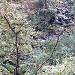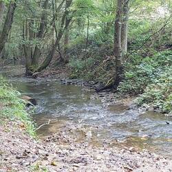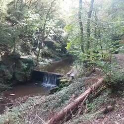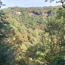 Bis kurz vor Burg Waldeck, die ich leider nicht besichtigt habe, verläuft der Weg durch ein enges Tal. Hier wechseln sich wildbizarre Felsen, schmale Steige und enge Pfade ab. Bis zur Schmausemühle hatte ich das Tal sogar ganz für mich alleine, aber danach wurde es lebhafter. 15 holländische Biker mit Kameras auf dem Helm kamen auf die glorreiche Idee, ihre Bikes durch die Klamm zu tragen, und zwei von ihnen wären dabei fast in die Tiefe gestürzt, mit einem Stahlseil in der einen Hand und dem Bike in der anderen Hand auf nassen Schiefer. Was soll da schon schiefgehen? Ein anderer Wanderer und ich schüttelten nur den Kopf, zumal noch engere Abschnitte vor uns lagen. Es gibt weiß Gott genug geeignete Wege, um mit dem Fahrrad durch die Täler zu fahren.