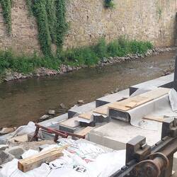 Der Weg zur Steinbachtalsperre war landschaftlich schön, führte aber wieder über Asphaltwege - was meine Waden mir nicht dankten. Auf dem Weg am alten Kloster Schweinheim vorbei gelangt man zur Steinbachtalsperre, die immer noch saniert wird. Man kann auch das dicke Loch in der Staumauer sehen. Entsprechend waren alle Einrichtungen geschlossen - normalerweise herrscht hier mehr Betrieb. Nachdem ich einige Straßenabschnitte passiert hatte, ging es wieder in den Wald. Etwa 8 Kilometer lang verlief der Weg größtenteils geradeaus auf breiten Forststraßen. Kurz vor Münstereifel befand sich ein großer Waldfriedhof, wo gerade eine Beerdigung stattfand. Ich war schon verwundert, warum Frank Sinatra durch den Wald schallte - es war die Abschiedsmusik. Weiter ging es auf breiten Waldwegen, bis der Weg auf die Via Coloniensis aus Köln traf. In Münstereifel wird immer noch viel renoviert, auch die Stiftskirche ist gesperrt. Insgesamt bin ich heute Vormittag gut 15 Kilometer von Schweinheim nach Münstereifel marschiert. Meine Füße schmerzen, daher werde ich jetzt erstmal eine längere Pause in Münstereifel einlegen und mir die Stadt anschauen. Die Kühle vom frühen Morgen ist verschwunden und die Sonne beginnt wieder zu brennen.
