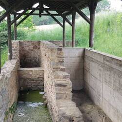 Mein Tagesziel liegt jedoch noch ein Stück entfernt: der Platz bei Kirf. In der Ortschaft Fisch freue ich mich über einen Automaten mit Getränken und Snacks – eine willkommene Überraschung! In Rehlingen besichtige ich die schöne Kirche und erhalte einen weiteren Stempel. Unterhalb entdecke ich eine Schutzhütte über einer Quelle – einst die Keimzelle eines längst verschwundenen Dorfes. Ich nutze das frische Wasser, um mich ein wenig abzukühlen.