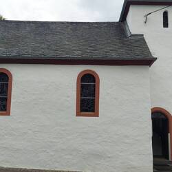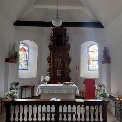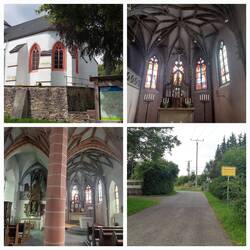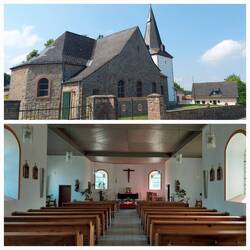 Nach einer längeren Strecke durch den Wald erreichte ich den Ort Roderath, wenn auch von der falschen Seite. Offenbar hatte ich das Zeichen des Jakobswegs übersehen. Dort entdeckte ich die Ruinen einer römischen Villa. Meine Reise führte mich daraufhin weiter über die Ortschaften Frohngau und Engelgau. In Engelgau nahm ich mir die Zeit, die örtliche Kirche anzuschauen, zumal eine Kirche immer angenehm kühl ist. Leider konnte ich den Stempel nicht finden. Der Turm dieser Kirche zeugte von vergangenen Zeiten, während das Kirchengebäude selbst im 19. Jahrhundert erbaut wurde. Von Engelgau aus führte mich ein langer, gepflasterter Weg durch das bezaubernde Genfbachtal bis zur Ahekapelle. Diese Kapelle, eingebettet in die malerische Landschaft, ist ein Zeugnis eines längst vergangenen Dorfes und wurde auf römischen Grundmauern errichtet. Glücklicherweise traf ich auf einen Gottesdienst, der gerade vorbereitet wurde, und konnte daher den Altar betrachten.