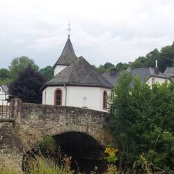Kronenburg, eine Perle im oberen Kylltal, war der Sitz verschiedener Geschlechter. Die Herren von Dollendorf sollen die Burg im 13. Jahrhundert gegründet haben; deren Burgruine steht bei Ahrbrück. Innerhalb der Ringmauer entwickelte sich eine Siedlung, die Stadtrechte besaß. Dennoch blieb Kronenburg wie viele Orte ein kleines Dorf, da es abseits der großen Wege lag. Im 13. Jahrhundert erwarb Luxemburg die Rechte und belehnte jeweils die Burgherren. Somit teilte Kronenburg das Schicksal der Grafschaft Luxemburg, die später zum Herzogtum Luxemburg wurde. Die Machthaber wurden Könige von Böhmen und deutsche Kaiser, doch später starb diese Linie aus. Ihr Land fiel an die Herzöge von Burgund und 1477 schließlich an die Habsburger. Kaiser Karl V. vererbte Luxemburg seinem Sohn Philipp von Spanien - daher der Name "Spanisches Ländchen" für die Region um Kronenburg. Besonders beeindruckend ist die Ein-Stützen-Kirche im "Städtchen", die nach dem Vorbild der Spitalkapelle in Bernkastel-Kues an der Mosel erbaut wurde. Bedauerlicherweise endete hier meine Tagestour. Ich wäre gerne weiter gewandert, doch ich musste den Schienenersatzverkehr berücksichtigen. Ich habe mir noch kurz die Talsiedlung angeschaut mit der schönen Kyllbrücke. Jakobsweg und Schneifelpfad sind nahezu identisch und laut Wandertafel liegen etwa 27 km demnächst vor mir bis Prüm. Um 15:40 bringt mich der Bus nun nach Dahlem zurück, dann mit dem Schienenersatz nach Kall und mit dem Zug nach Euskirchen und Bonn.