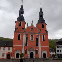 Ein sehr langer Wald- und Wiesenweg führte dann hinunter nach Gondenbrett. Übrigens ein Tipp: Vor Gondenbrett befindet sich die Trekkingplattform "Abgetaucht". Oberhalb der Kirche von Gondenbrett gab es einen schönen Rastplatz direkt an einem Quellbrunnen, Hühner und Gänse am Bauern inklusive. Danach ging es steil hinauf zum Katzenkopf mit einem schönen Rundblick, man konnte schon den Kalvarienberg und das Prümer Krankenhaus sehen. Über den Ortsteil Tafel ging es hinauf zum Kalvarienberg, quasi dem Hausberg von Prüm, wo ich mir den Explosionskrater anschaute. 1949 explodierte hier ein Munitionsstollen mit 500 Tonnen Sprengstoff. Dabei wurde die Innenstadt schwer zerstört, nachdem die Stadt schon 1944 verwüstet worden war. In Prüm besichtigte ich zunächst die berühmte Abteikirche.