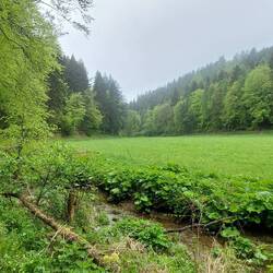 Um 4 Uhr bin ich das erste Mal vom Regen aufgewacht. Ab 5 Uhr konnte ich endgültig nicht mehr schlafen und da es gerade aufgehört hatte zu regnen, packte ich schnell meine Sachen und verließ gegen 6 Uhr den Campingplatz in Prüm. Anstatt zurück in die Stadt zu gehen, folgte ich dem Schneifelpfad, der bald wieder auf den Jakobsweg traf. Durch den vielen Regen waren die Wege heute besonders rutschig und ich bin zweimal gestürzt. Selbst auf dem Asphalt war es rutschig, weil die Erde von den Feldern auf die Wege floss. Danach ging es hinunter in die Schönecker Schweiz, ein Highlight, ein wirklich schönes Wald- und Wiesental mit schroffen Felsen am Wegesrand. Überall roch es nach Bärlauch. Vor Schönecken wurde der Regen immer stärker. Vor dem Ort verließ mich der Schneifelpfad nach Birresborn. Wegen des Regens verzichtete ich auf den Aufstieg zur Burgruine Schönecken, die einst von den Grafen von Vianden erbaut wurde. Weiter ging es am Ufer der Nims entlang, immer noch vom Regen begleitet. Ein langer, steiler Waldweg führte mich von Nimsreuland unter der Autobahn hindurch hinauf nach Lascheid. Leider gab es auf der ganzen Strecke keine Schutzhütte, so dass ich weiterlief. Von Lascheid waren es noch 5 Kilometer auf Asphalt bis zum Ziel in Waxweiler. An der Mariensäule kam ich allerdings nicht vorbei, da der Weg zu matschig war. Nach gut 27 Kilometern erreichte ich Waxweiler und steuerte den Campingplatz am Ufer der Prüm an. Leider sind alle Wiesen aufgeweicht und auch der Campingplatzbesitzer rät mir davon ab. Ich beschließe nach Hause zu fahren, zumal trotz Regenschirm und Regenschutz alles nass ist und warte erst einmal das Wetter ab. Morgen soll es wieder regnen und der Weg nach Neuerburg führt nur über Asphalt, was bei Regen nicht so schön ist.
