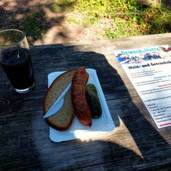 An der Driesch-Hütte gönnte ich mir schließlich eine längere Pause. Die Mettwurst mit Brot und Gurke sowie später ein Stück Kuchen waren eine Wohltat. Ein Glas Riesling zum Kuchen durfte nicht fehlen. Schließlich erreichte ich den Prinzenkopf mit seiner berühmten Aussicht. Es ist immer wieder erstaunlich, wie sich die Mosel in die Landschaft aus Schiefer und Quarzit geschnitten hat. Der Ausblick ist einfach atemberaubend und belohnt den steilen Aufstieg.