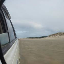Gemeinsam fahren wir zurück und nehmen die Ausfahrt, die wesentlich sandiger als der Strand ist. Am Horizont sind riesige, goldene, wüstenähnliche Sandberge zu sehen. Trotz des Sandes bleibt uns nichts anderes übrig, als diese Ausfahrt zu nehmen, da es insgesamt nur 3 Zu- und Ausfahrten gibt und die nächste liegt mindestens eine Stunde Fahrtzeit zurück und lässt sich mit Sicherheit gar nicht mehr erreichen, da die kritische Stelle aufgrund der Flut jetzt nicht mehr passierbar sein wird. Augen zu und durch!