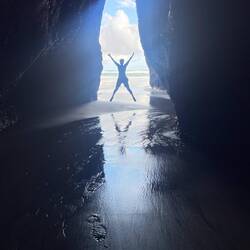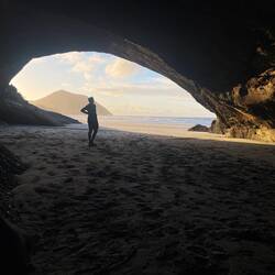 The weather was holding so we carried on north to Farewell spit and Wharariki beach. This beach is beyond the back end of nowhere but boy does it deliver! A beautiful forest walk through a deafening chattering choir of cicadas opens onto dunes and a huge beach with crashing waves and arched islands that are like sculptures in the sea. Throw in a few caves, cute seal pups and the beautiful last of the day light casting long shadows and it was a quasi- religious experience. Stunned into silence. Almost.