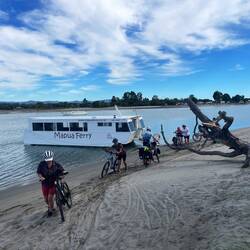 Day 2 of the ride meandered northwards, following the coast in places, popping out in Mapua and the ferry across to Rabbit Island. This is very much Dorren and Mikes stomping ground and we found ourselves in their local cafe for lunch.