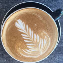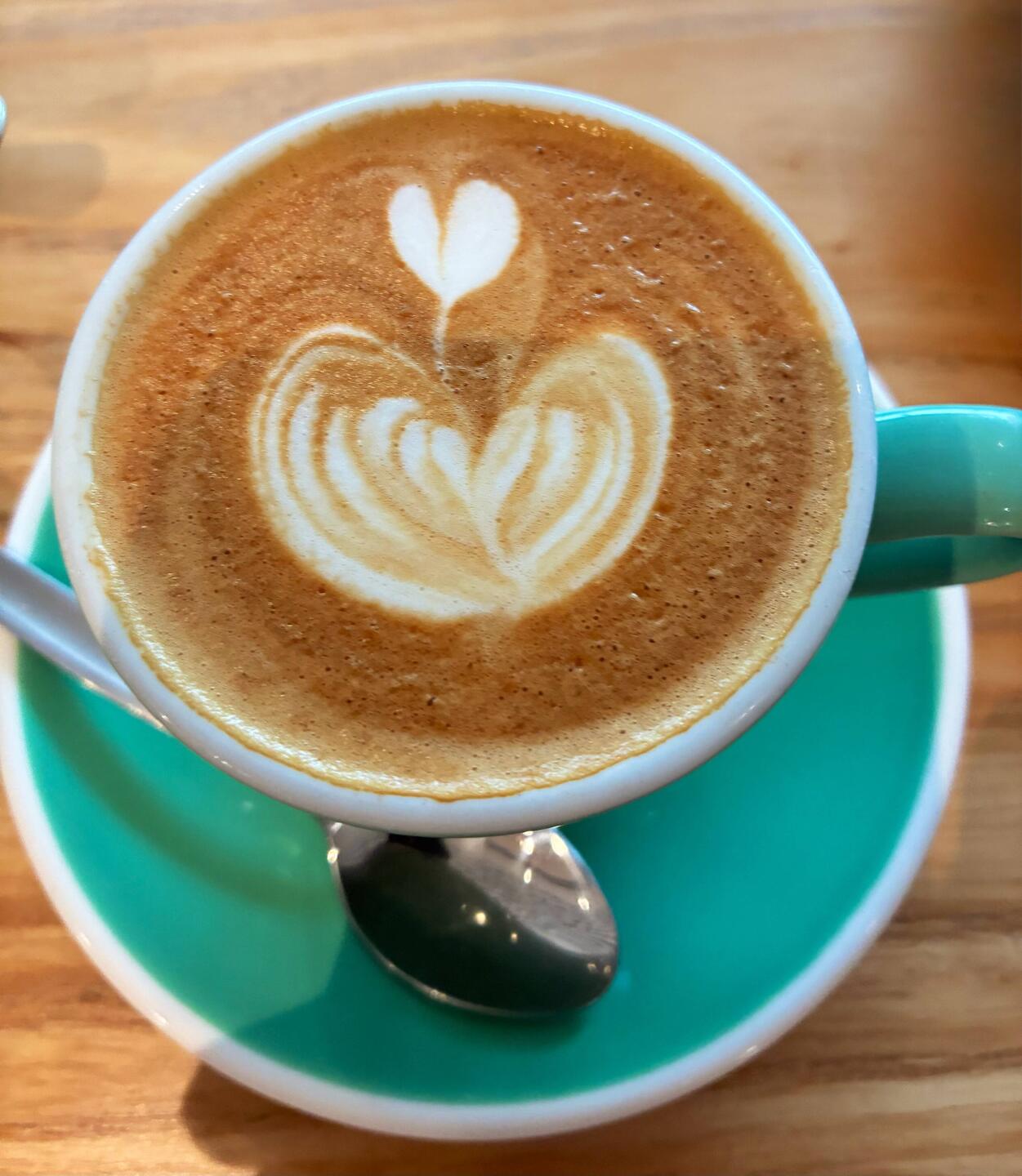 Zuerst kommt das Süsse, später der Kaffee. Toni trinkt „Flat white“ mit einem schönen Muster im Milchschaum, ich trinke „Long black“.