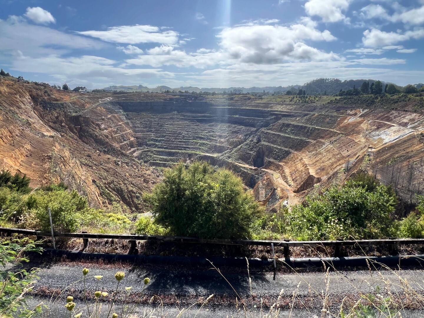 Im Regenwetter ist es nicht so gemütlich am Strand, deshalb fahren wir landeinwärts zur Stadt Waihi, wo wir rund um die riesige Goldgrube „Martha Mine“ wandern. Hier wurde bis 2017 im Tagabbau nach Gold geschürft, ein grosser Erdrutsch beendete die Tätigkeit. Es ist besonders eindrücklich, wie nah die Stadt neben diesem etwas unheimlichen Loch gebaut ist, und wie hier wahrscheinlich grosse Risiken in Kauf genommen wurden. Auf unserer Wanderung kommen wir auch vorbei an neu gepflanzten Kauribäumen, damit hat die Minenkooperation einen Anfang gemacht zur Wiederherstellung der Umgebung. Allerdings gibt es bereits ein Projekt zur Eröffnung einer neuen Grube, das können wir bei den Informationstafeln lesen.